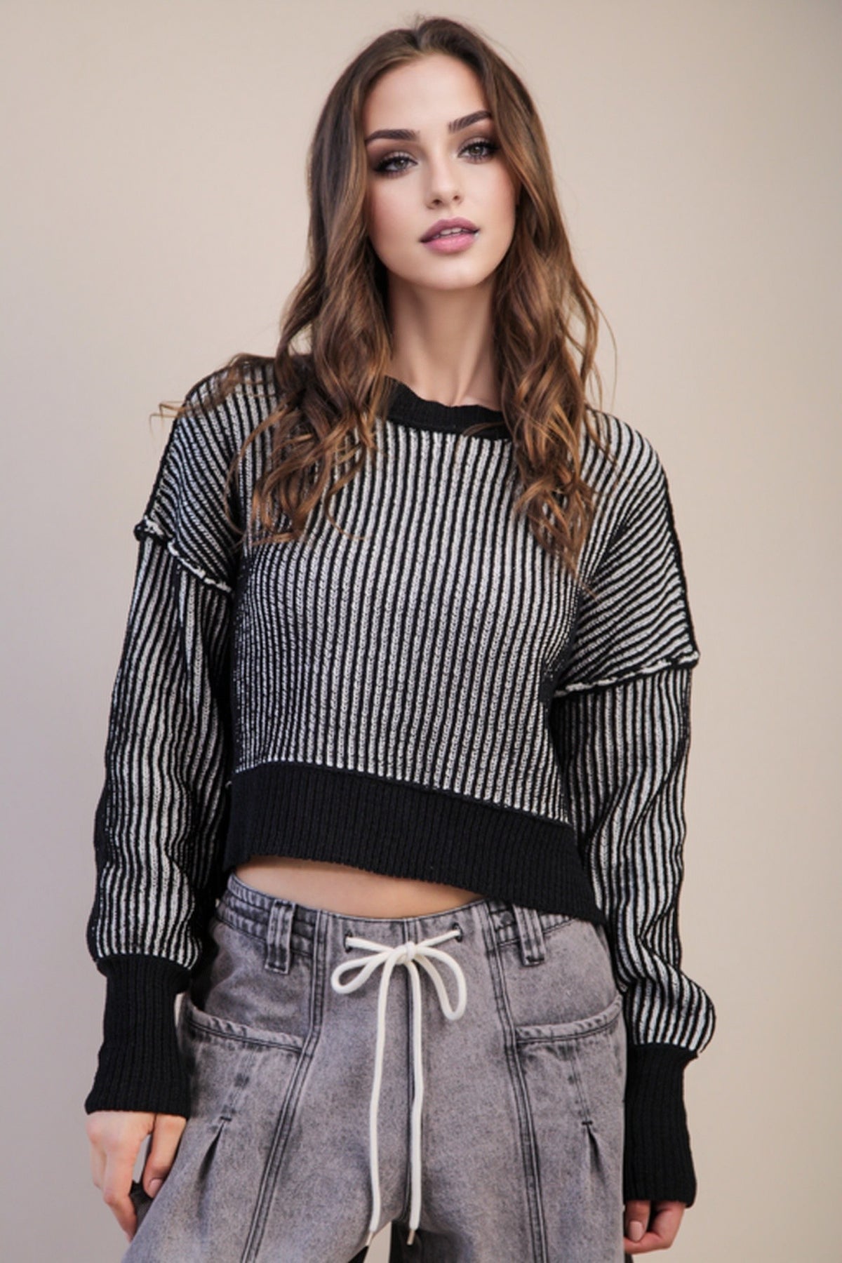 Casual, cozy, and effortlessly cool—the Two Tone Stripe Sweater is the kind of throw-on piece you’ll reach for again and again. Designed with a relaxed oversized fit, this sweater features a modern two-tone striped pattern with a classic round neckline and drop shoulders for that laid-back, lived-in feel.
